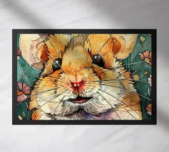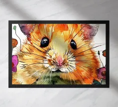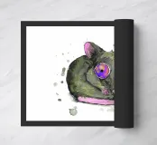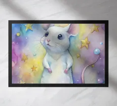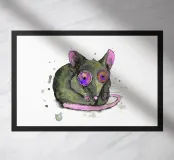 A spotty watercolor drawing of a black rat. Grunge dripping style. He has big purple eyes. He looks at you in bewilderment.