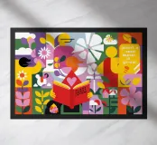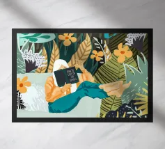 A person is engrossed in a book surrounded by vibrant flowers, with the words "turn a new leaf" creating an inspiring and beautifully illustrated piece about growth, reading, and new beginnings.