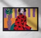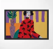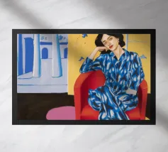 A woman in a red bird print robe sits in a patterned room holding coffee with a quiet yet graphic presence.