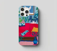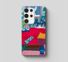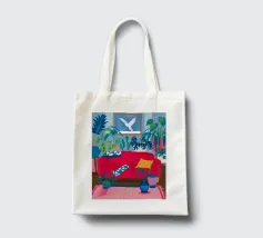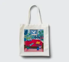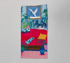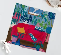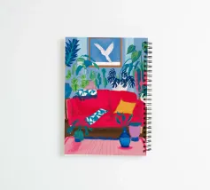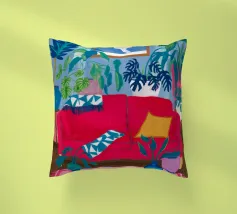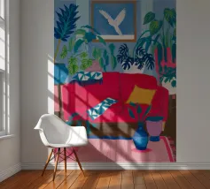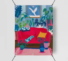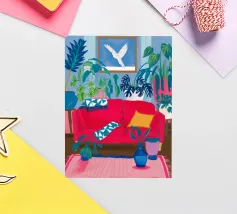 An interior scene with a person reading on a red sofa, surrounded by plants, books, and a window with birds flying outside. The style is cozy, colorful, and illustrative.