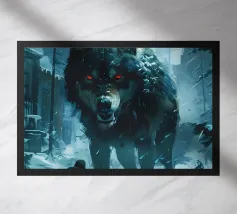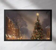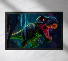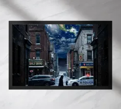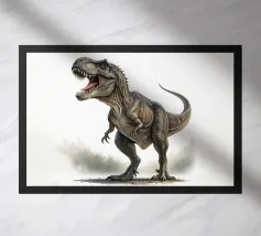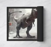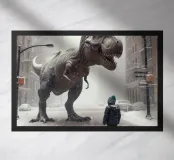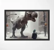 A massive T-Rex towers over a young child in a winter city scene, surrounded by snow-covered streets and tall buildings. The surreal encounter juxtaposes prehistoric power with a modern urban landscape.