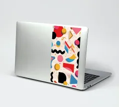 A vibrant and dynamic abstract collage featuring a mix of colorful organic shapes, geometric elements, and bold black forms. The composition is energetic, modern, and has a strong sense of movement.