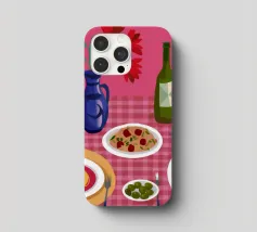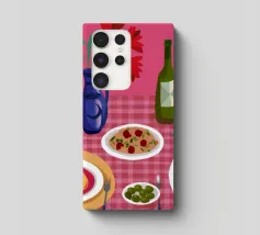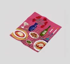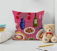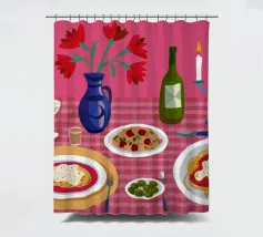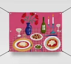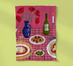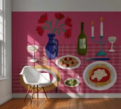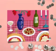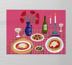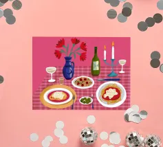 A cozy and romantic dinner table setting for two, with plates of food, wine glasses, a bottle of wine, a vase of red flowers, and candlelight, evoking an intimate and celebratory atmosphere.