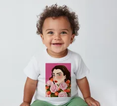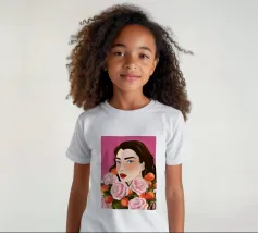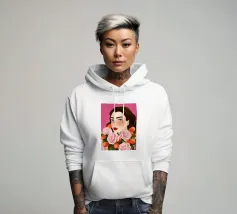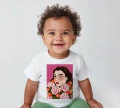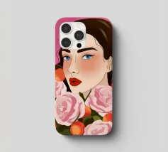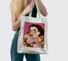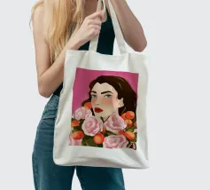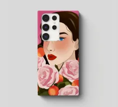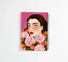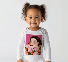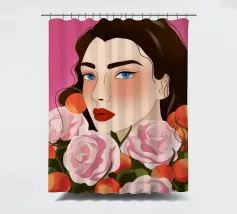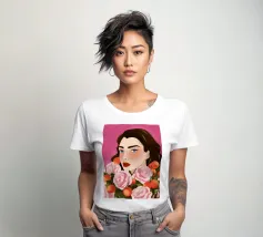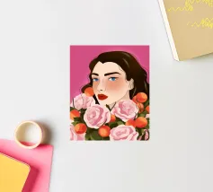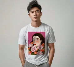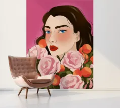 A person with brown hair is surrounded by large pink roses, set against a matching pink background. The harmonious composition radiates calm and floral elegance.
