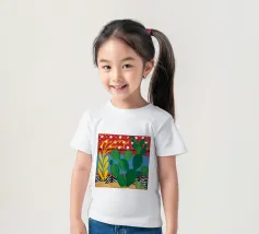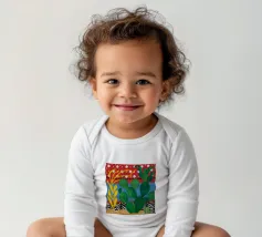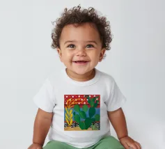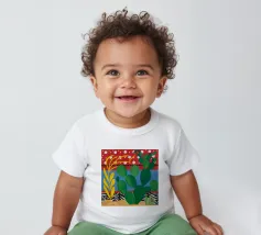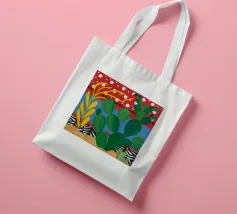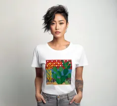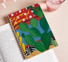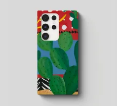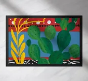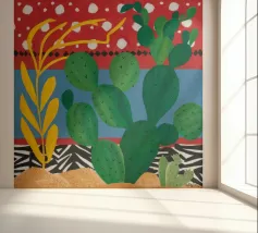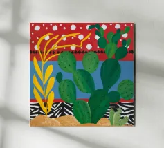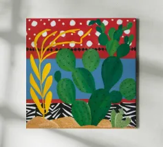 A vibrant collection of stylized cacti in colorful pots is set against a bold red background featuring a whimsical pattern of lights or beads, creating a playful and modern botanical composition.