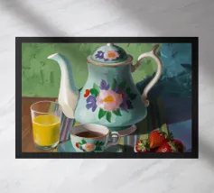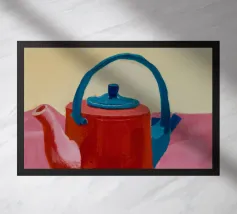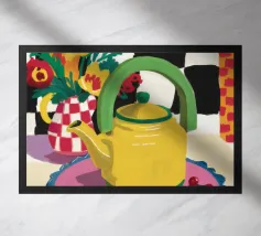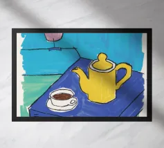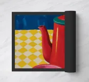 A classic coffee moment is captured with a tall red coffee pot and a pink cup on a yellow and white checkered tablecloth, set against a deep blue background, creating a cozy and colorful scene.