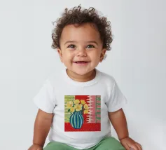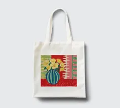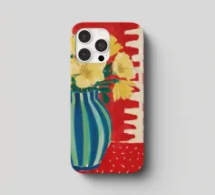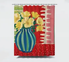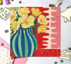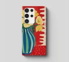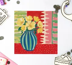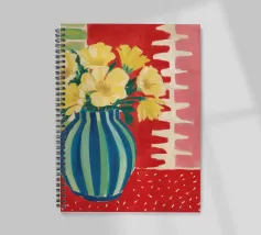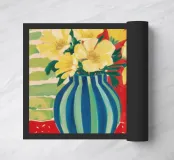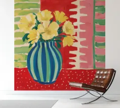 A still life featuring a bouquet of yellow flowers in a green and blue striped vase, set on a bright red, textured surface against a pink striped wall.