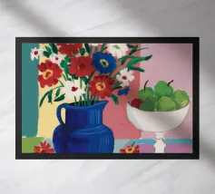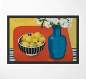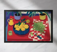 An inviting still life on a bright red table, featuring a bowl of lemons and a blue vase holding delicate white flowers. The warm yellow background enhances the cozy and vibrant atmosphere.