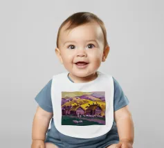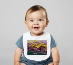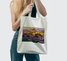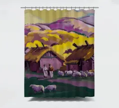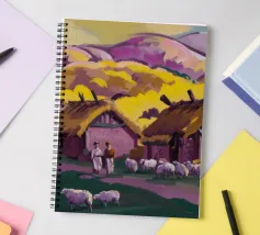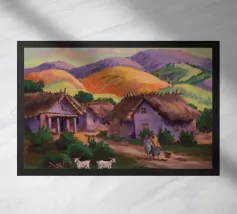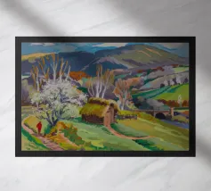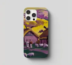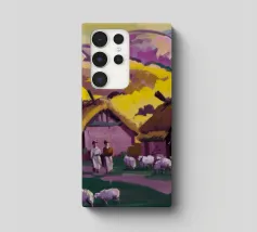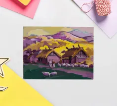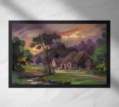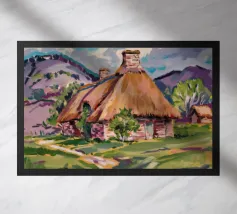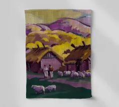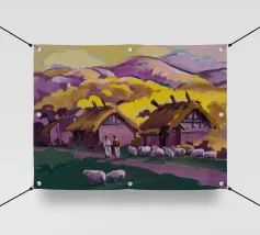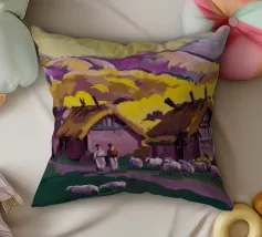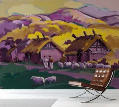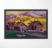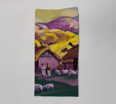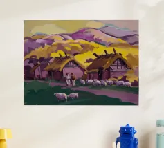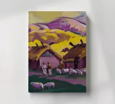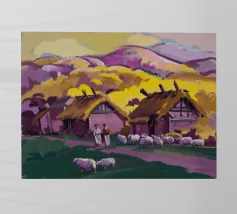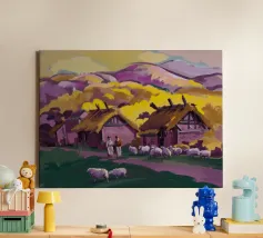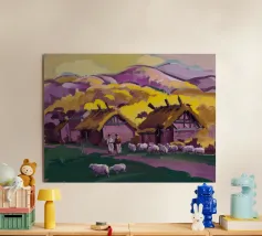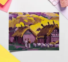 A vibrant painting shows a quaint farmhouse with a thatched roof, surrounded by sheep grazing in a field of purple and yellow, with rolling hills in the background, evoking a sense of bucolic life.