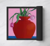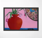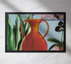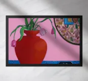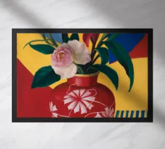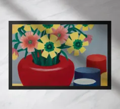 A bold red vase, filled with various flowers, sits on a blue patterned surface, with a dynamic pink and patterned background creating a richly textured and colorful composition.