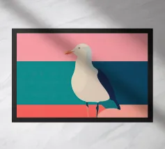 The picture shows a minimalist seagull illustration with a clear, graphic style. The seagull has a white body, blue wings with white accents and a yellow beak and legs. The background is blue, which creates a nice contrast to the white seagull. The style is simple, modern and decorative, with a reduced colour palette and clean lines - almost like a stylised logo or modern wall art. A beautiful example of graphic design art!
