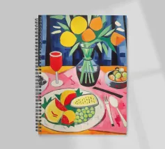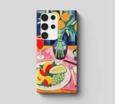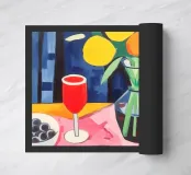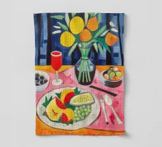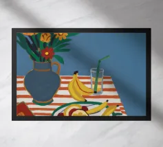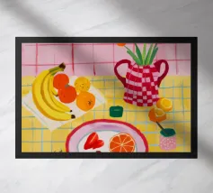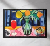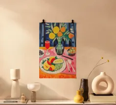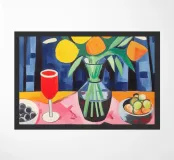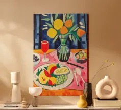 An elegant table set with a bowl of fruit, vibrant flowers and a wine glass creates a harmonious Mediterranean atmosphere. The contemporary painting and vibrant colours make this still life an eye-catcher in any room.
