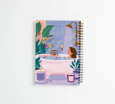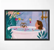 An illustration of two women relaxing together in a bubble bath, surrounded by lush plants. The scene is an intimate, serene, and beautiful depiction of shared self care and friendship.