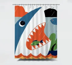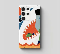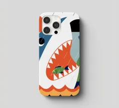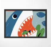Enjoy a vibrant ocean illustration featuring a shark attacking a fish in the sea with rain and clouds in the background.