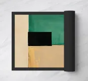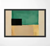 Minimalist painting in the style of white on a beige background, three rectangular colour fields in emerald green and black with gold leaf accents. One field is monochrome and the other two fields have subtle colour gradients. Minimalism, painting.