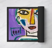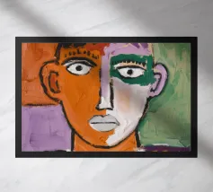This painting features a simplistic abstract character with minimal lines and a mix of pink, green, and brown hues. The background is clean and uncluttered, emphasizing the simplicity of the design.