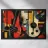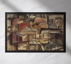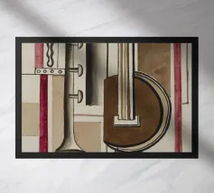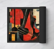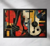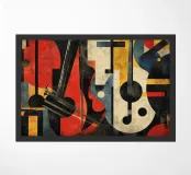 A modern abstract painting featuring geometric shapes forming guitars, violins, and musical notes in a bold, colorful composition. The textured background and dynamic arrangement evoke a sense of rhythm and artistic expression.