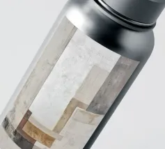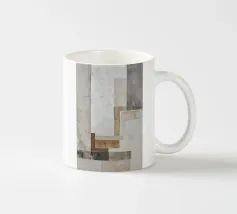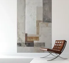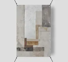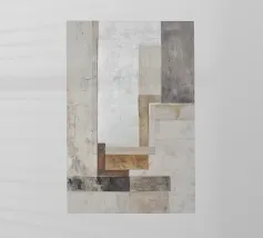 This abstract design combines industrial elements with earthy colours and minimalist shapes. Layered textures of paper and building materials, combined with brushstrokes, create a fascinating depth and reflect the boho style in contemporary design.