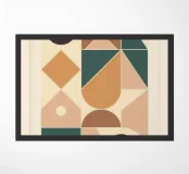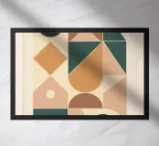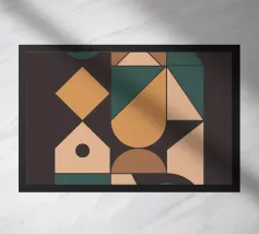 An abstract artwork of geometric shapes in earthy green, orange, and beige tones, arranged with balance on a textured light background.