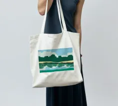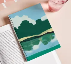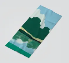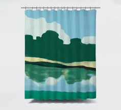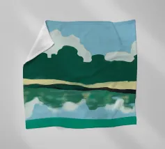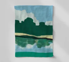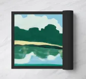 Lush green hills are juxtaposed against a sky filled with fluffy white clouds, while below, their reflection is mirrored on the rippling water. The image uses a simple color palette and abstract shapes to evoke a serene landscape scene.