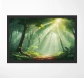 Dappled sunlight streams through the trees of a verdant forest, illuminating the path below and highlighting the rich green foliage. The air is fresh and inviting, perfect for exploration.