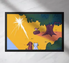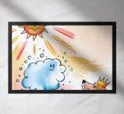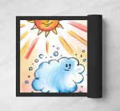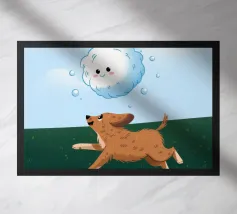 A crowned dog gazes upward at a smiling cloud and radiant sun. The imaginative setting invokes a sense of fantasy, celebration, and warmth beneath the glowing rays.