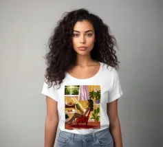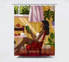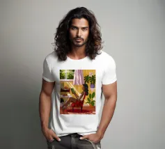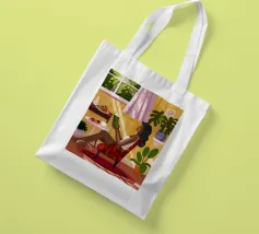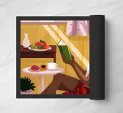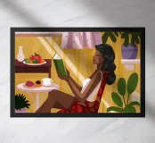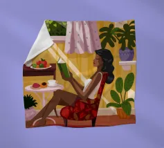 This painting illustrates a person sitting in a red armchair, reading a book in a sunlit room. The space is filled with plants and a small table with a teapot and cup, creating a cozy and inviting atmosphere.