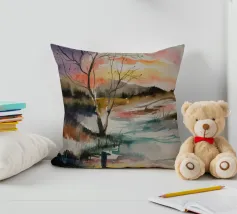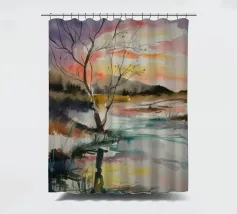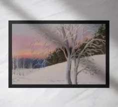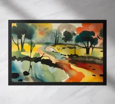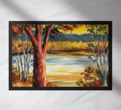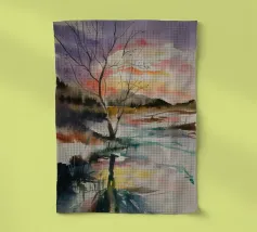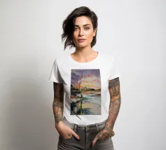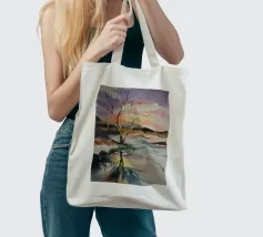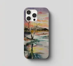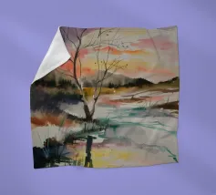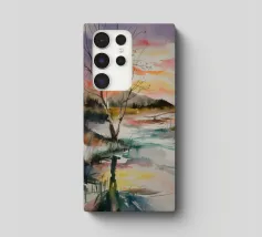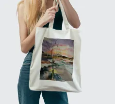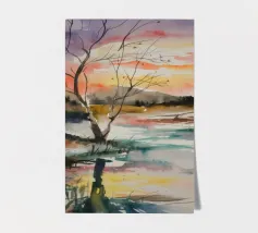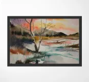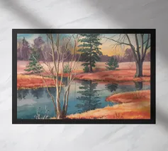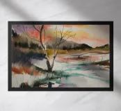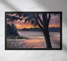 This painting captures a sunset over a marshy landscape, with reflections in the water. The warm hues and tranquil setting evoke a sense of calm and beauty.