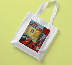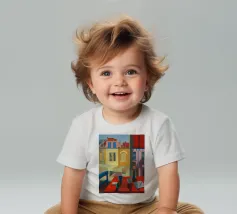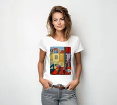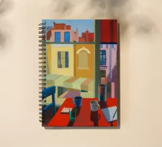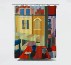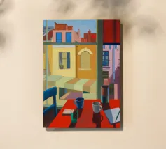 Sun-kissed rooftops beyond an indoor table set in vibrant red hues conjure a dynamic contrast of intimacy and view.