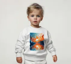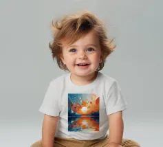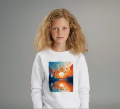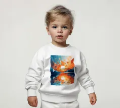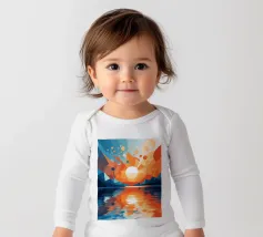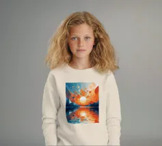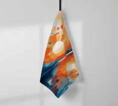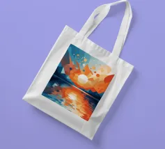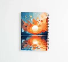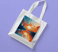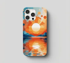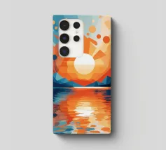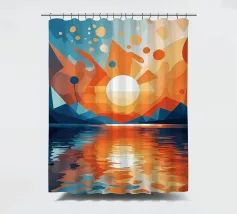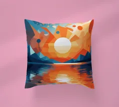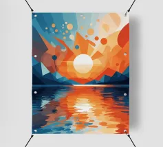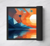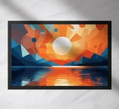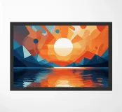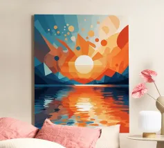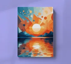 This vibrant abstract artwork captures the breathtaking beauty of a sunset over a calm lake. The geometric shapes and bold colors create a sense of awe and wonder, inviting the viewer to immerse themselves in the peaceful scene. The reflection of the fiery sky on the water's surface adds depth and tranquility to the composition.