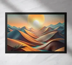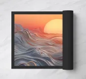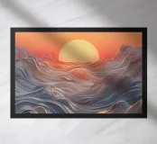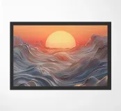 A mesmerizing abstract seascape depicting a sun setting over undulating, flowing waves. The vibrant orange hues blend seamlessly with cool blues, creating a breathtaking and serene atmosphere.