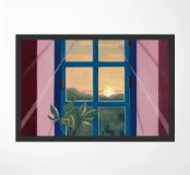 A tranquil scene of two cups of tea on a windowsill, with a view of a beautiful sunset through the window. The composition is peaceful, romantic, and captures a perfect, quiet moment.