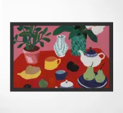 A charming still life of a tea set with delicate cups, a teapot, sweets, and white flowers, arranged on a table, evoking a sense of calm and traditional elegance.