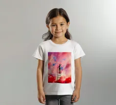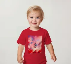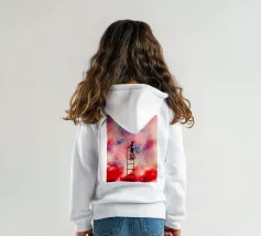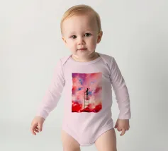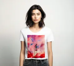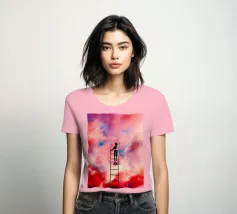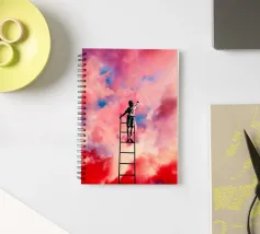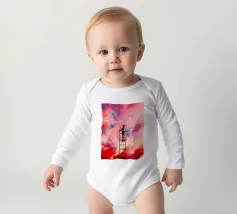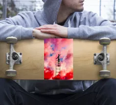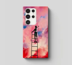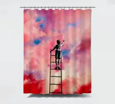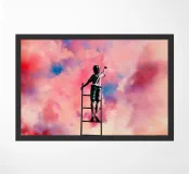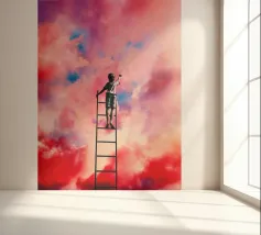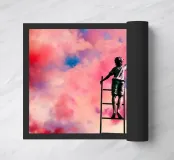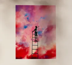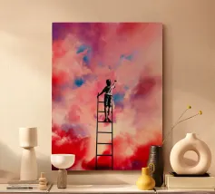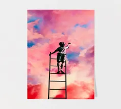Elevate your space with the Cloud Painter artwork, featuring a whimsical scene of a child atop a ladder, immersed in the act of creating or altering the vibrant clouds in the sky. This design captures the essence of creativity and the limitless bounds of imagination. It's a perfect enhancement for an artist's studio, children's room, or any area where inspiration and dreamlike wonder are desired. Each brushstroke in the sky blends hues of pink, red, and blue, crafting a colorful canopy that breathes life and movement into your room.