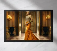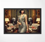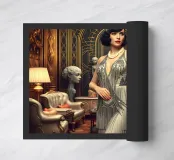 Elegant Flapper in Luxe Beaded Dress, Pearls, and Art Deco H... This image showcases a glamorous flapper girl surrounded by opulent metallic accents, lavish furnishings, and ornate decor, blending futuristic and Art Deco elements with organic curves and dreamy surrealism.