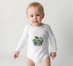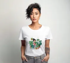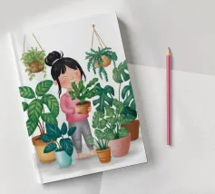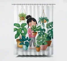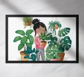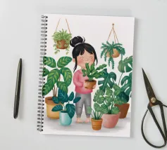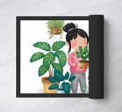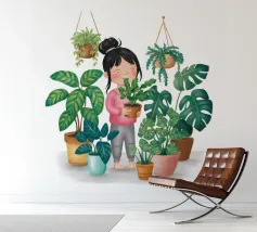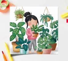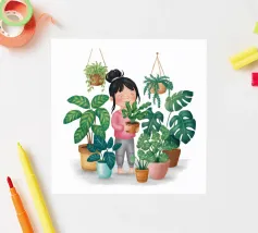 A child surrounded by potted houseplants waters one lovingly, capturing pure joy and care for growing life.