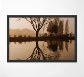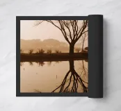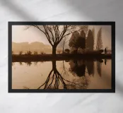 The water below mirrors the tree perfectly, capturing every leaf and curve in a soft, shimmering reflection. The surface is calm, like glass, blurring the line between reality and its mirrored twin. As light shifts gently across the scene, the reflection seems to move with it — a quiet dance of nature and water, beauty and balance