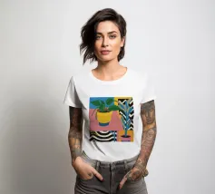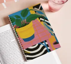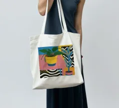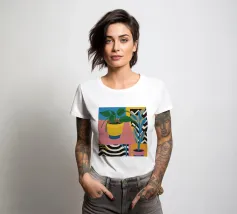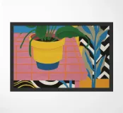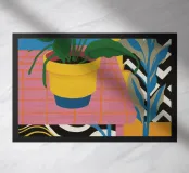 A potted houseplant with lush green leaves sits on a pink table. The background is a dynamic mix of geometric patterns, including a bold black and white design, creating a modern interior scene.