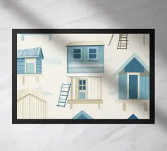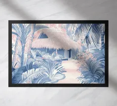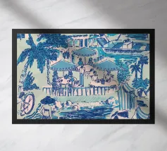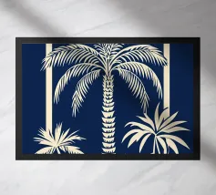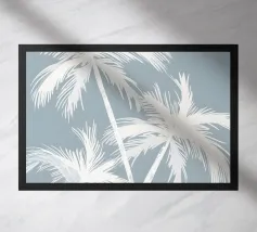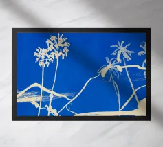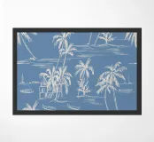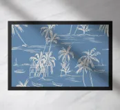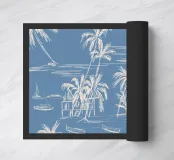 Landscape of palms, boats and beach in blue and beige