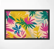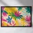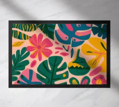 A vibrant and spreading pattern of stylized tropical leaves in shades of yellow, pink, teal, and green, creating a lush and energetic botanical display.