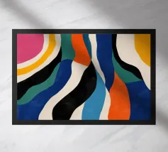 Bright colours in flowing movement: This modern art poster shows intertwined, ribbon-like shapes in pink, orange, yellow and blue. The curved composition creates a dynamic balance and visual depth through overlapping transparencies. Perfect for creative spaces, modern interiors and colourful walls with a design focus.