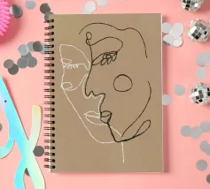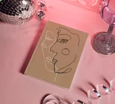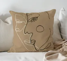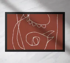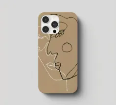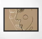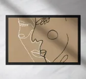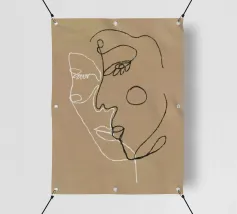 A single continuous line creates the abstract profile of a face on a beige background. The simplicity of the line drawing contrasts with the complexity of the human features it suggests, offering a minimalist interpretation of a portrait.
