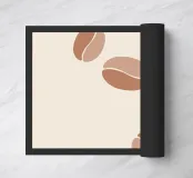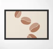 Coffee beans in varying shades of brown appear to float against a light beige background. The minimalist style emphasizes the smooth, rounded shapes of the beans.