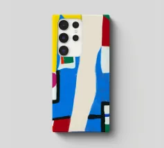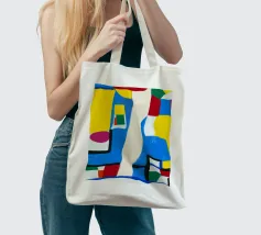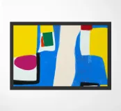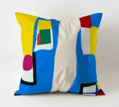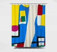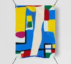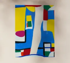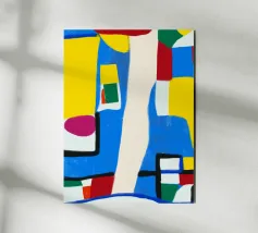 Bright and bold geometric shapes are scattered across a vibrant blue background, with a tall, central, cream-colored vertical form. The composition uses primary colors, creating a lively and dynamic visual effect.