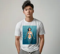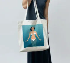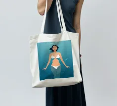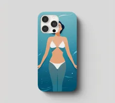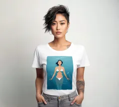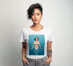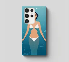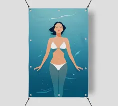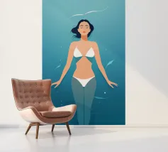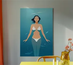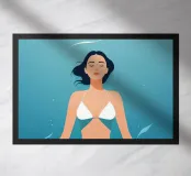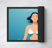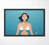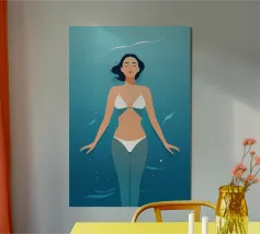 A woman floating effortlessly in clear water, her form blending with the ocean’s calm. This minimalist piece captures freedom, stillness, and connection with nature.