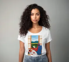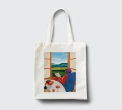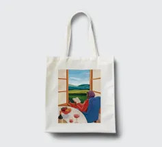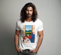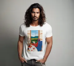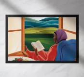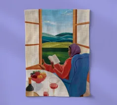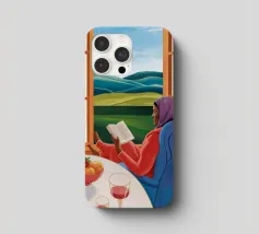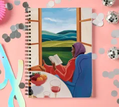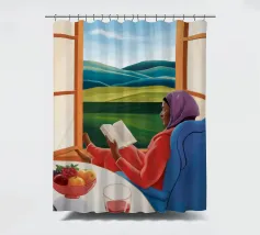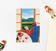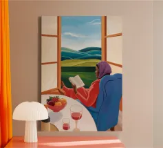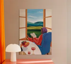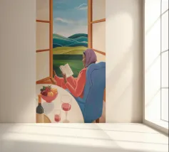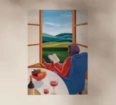 A figure is engrossed in a book while seated at a table by a window, with a wine glass nearby. The window offers a view of rolling green hills and a blue sky, creating a tranquil scene of repose and intellectual escape.