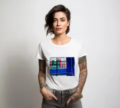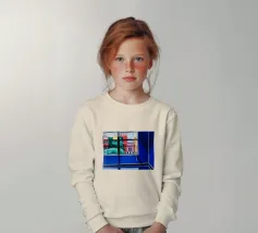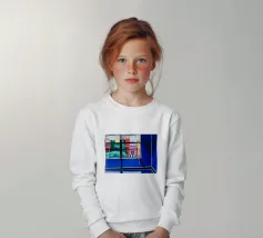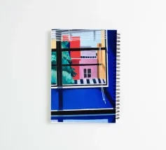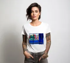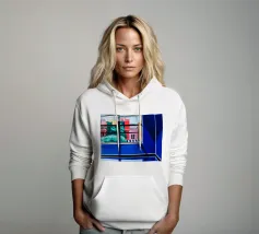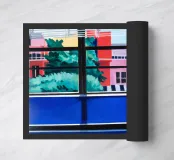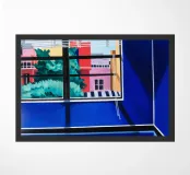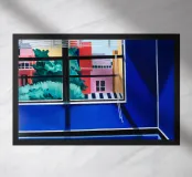The view through a window reveals a colorful city with red and blue buildings, creating a sense of looking out from a quiet interior into a vibrant world.