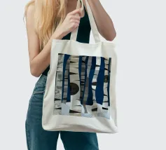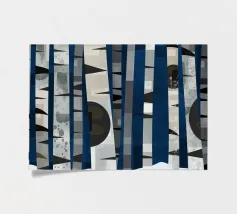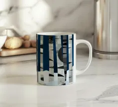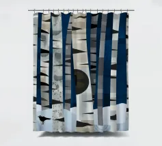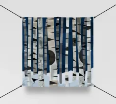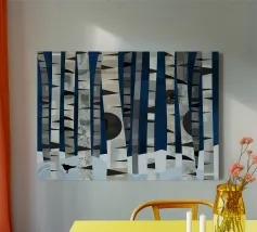 Tall birch trees with distinctive black and white bark stand in a snowy forest. A small bird leaves tracks in the snow under the tree canopy. The scene is composed with geometric shapes and muted colors.