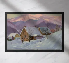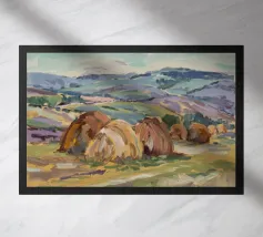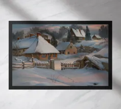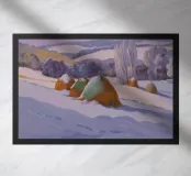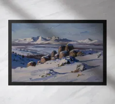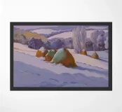 A stark yet beautiful winter landscape centered on two prominent haystacks standing resiliently in a vast, snow-covered field, with a line of bare trees in the distance under a muted, overcast sky.