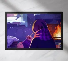 A cozy room with a fireplace, a table set with tea and snacks, and a view of a snowy landscape outside. The scene exudes warmth and tranquility, perfect for a winter retreat.